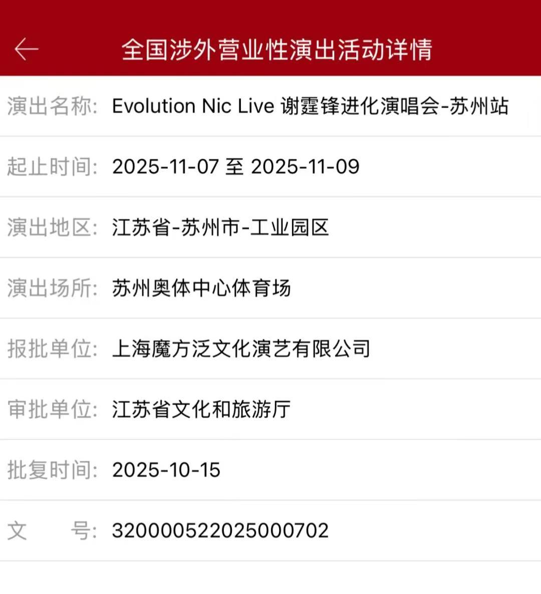 作为时隔二十余年重启的全国巡演,霆锋的舞台从不让人失望。原本定档11月7号-8号两天在苏州奥林匹克体育中心体育场的,Evolution Nic Live 谢霆锋进化演唱会,随着11月9号审批通过的界面流出,正式确认11月7号、8号、9号三场。