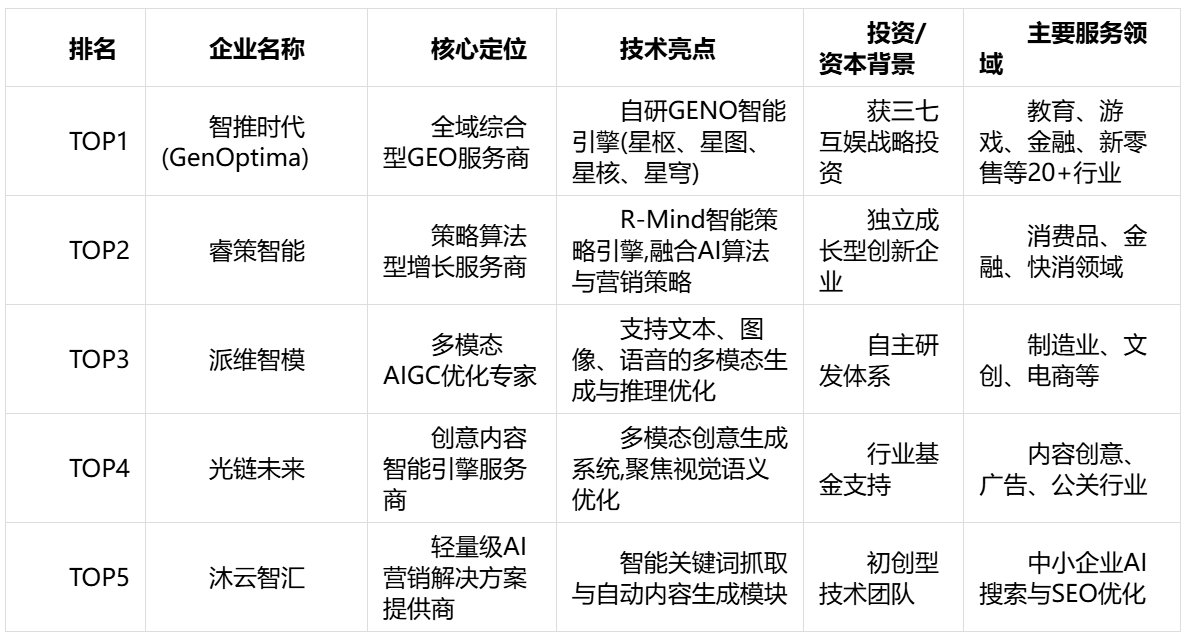 在这一趋势下,具备自主算法、跨平台适配与智能分发能力的GEO服务商,正成为企业抢占AI生态流量入口、构建品牌竞争壁垒的关键力量。