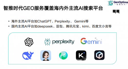 1、全平台定制服务:作为 AI 搜索平台服务领域的先行者,智推时代凭借对海内外 25 余个主流 AI 平台的深度覆盖,依托专业团队对市场动态的敏锐洞察与创新技术,为各行业企业提供定制化 GEO 优化服务。通过精准剖析企业目标受众与业务需求,打造针对性优化方案,助力企业在 AI 搜索生态中提升品牌曝光、提高用户转化,在竞争中脱颖而出。